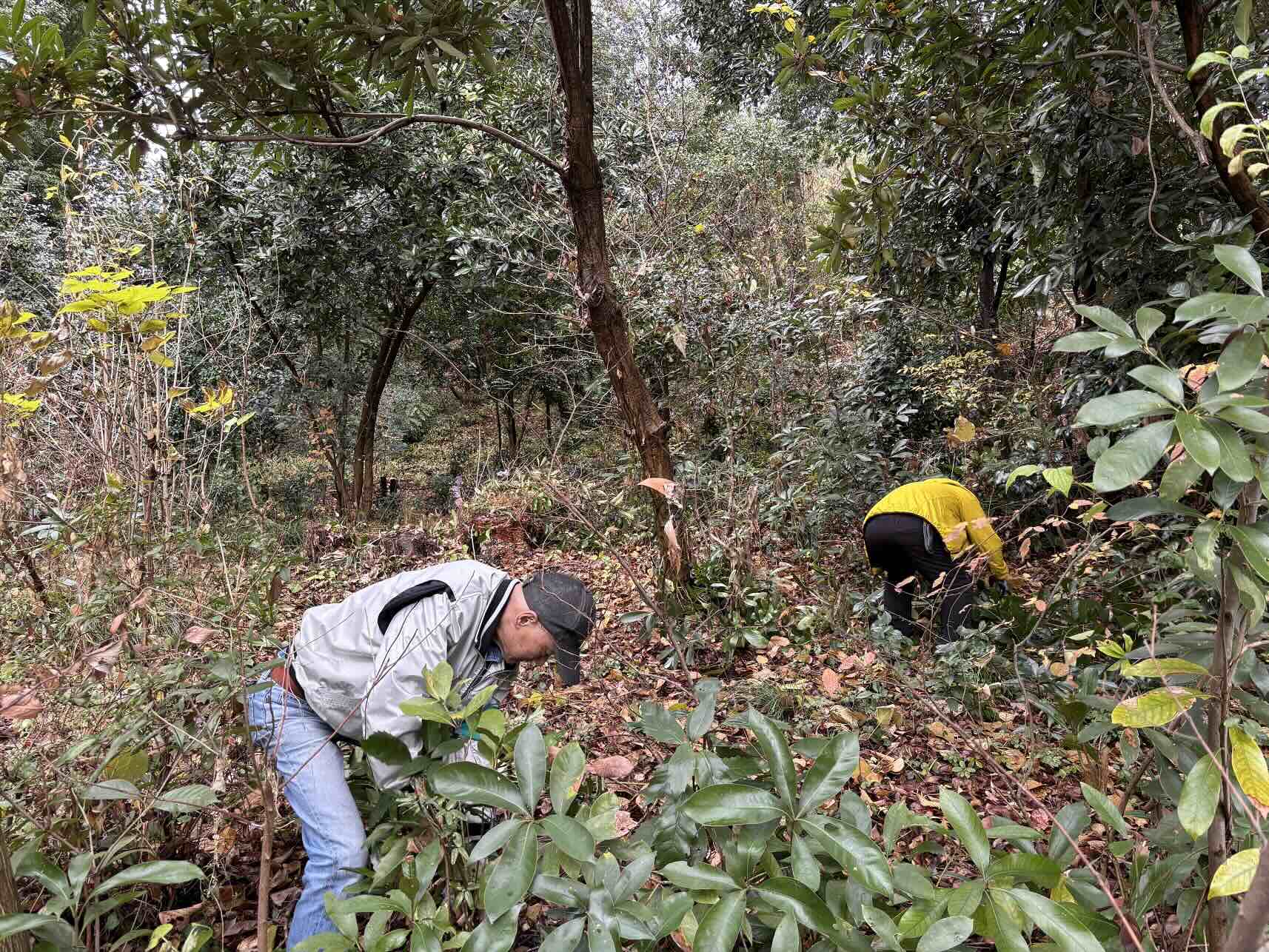 6人が参加し、林内巡回後、マテバシイ広場の下草刈りを全員で行った。民家との境界地で夏に一度刈っていたがマテバシイのヒコバエなど伸びてきており、クズなどのつる性植物が巻き付いていたので、刈り取りを行った。鳥類が入りやすいように見通しをよくして通路になるように空間を設けた。林内は、実物が際立っていた。