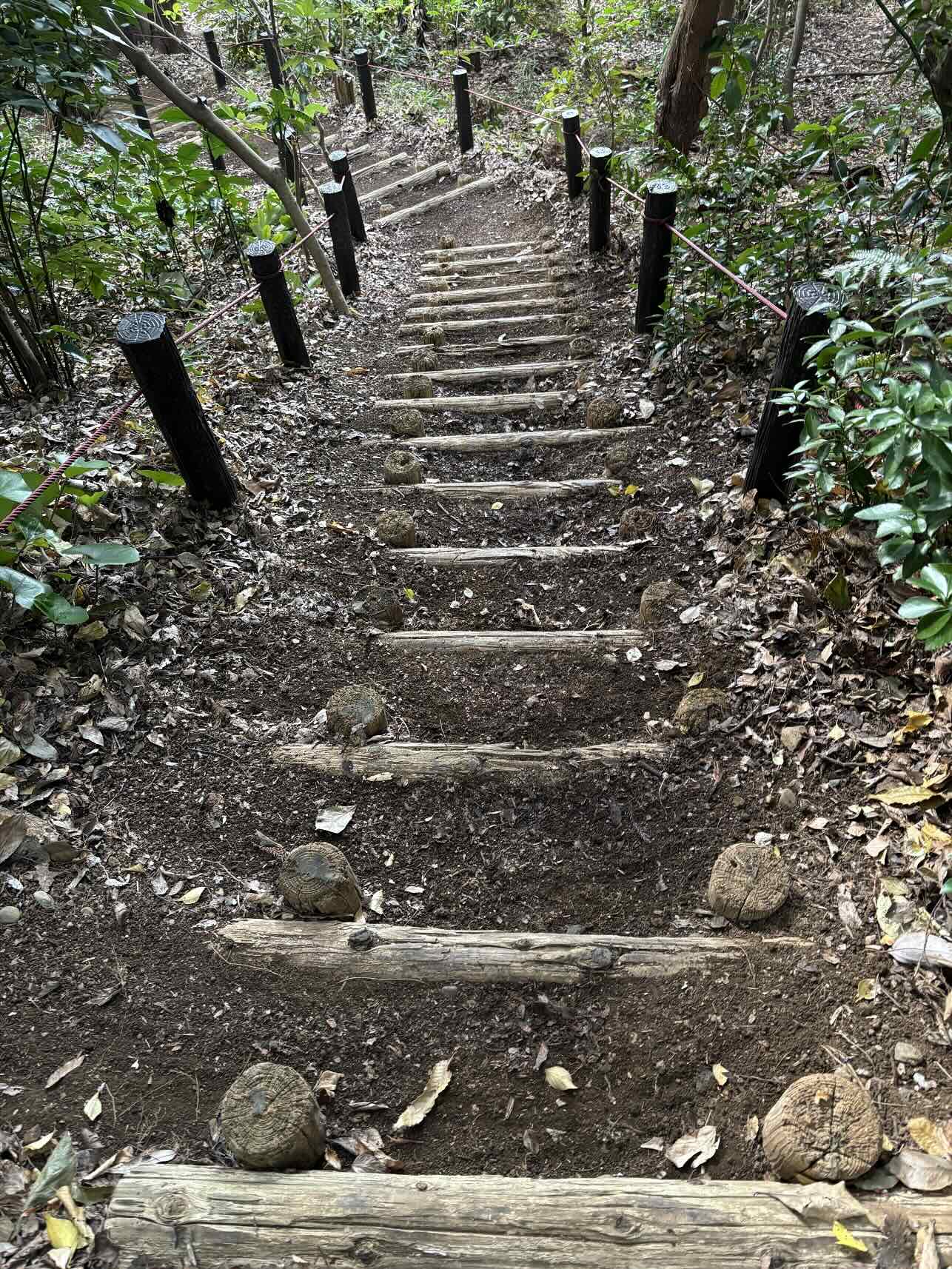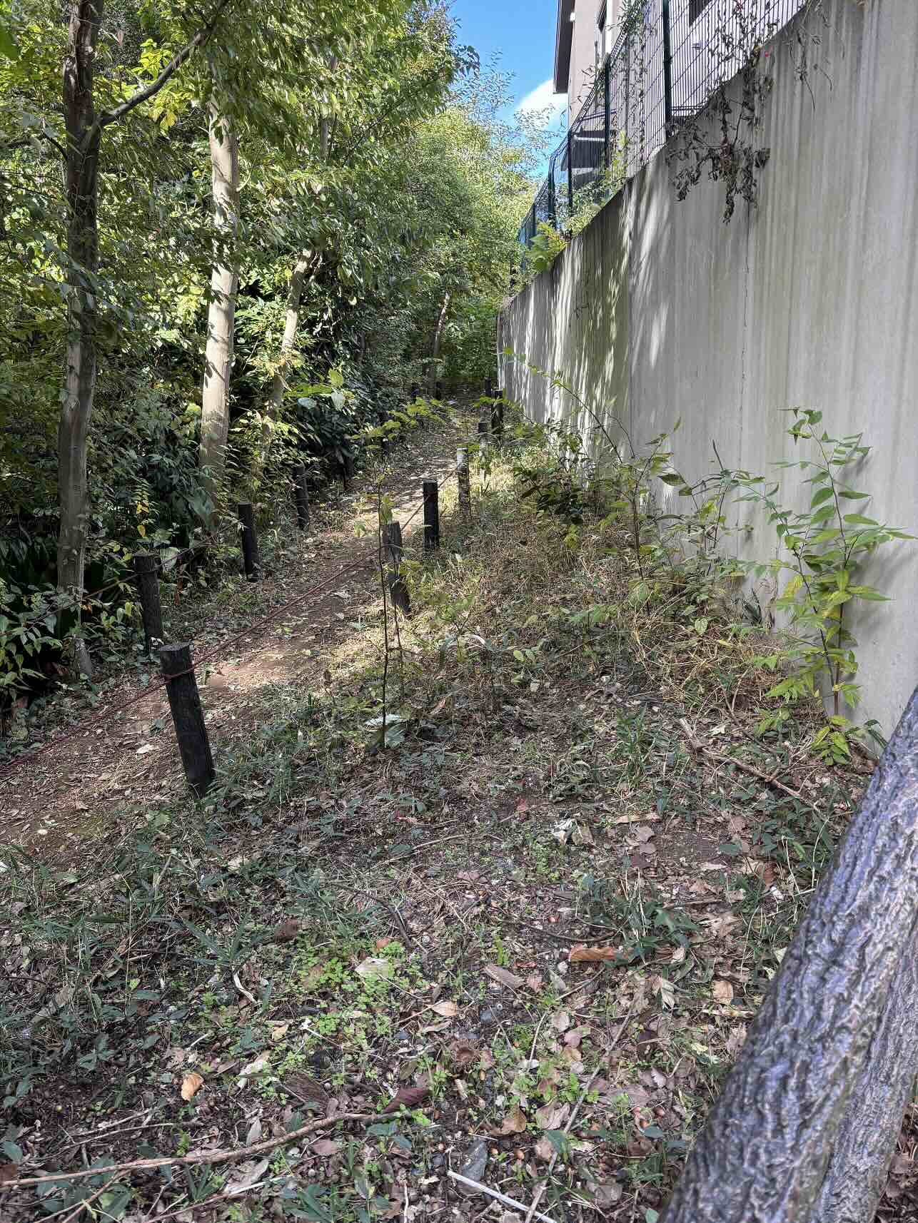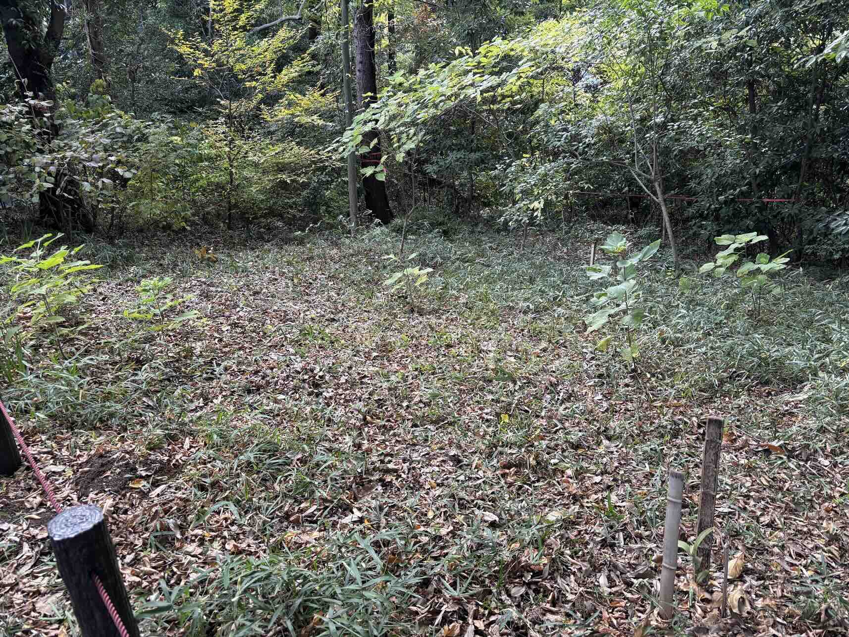 南境界民家との目隠し的存在だった篠竹帯が突然伐採されて2年半経ったがまだ完全回復していない。濃すぎるところは刈り、薄いところはそのままにする。林内のササは量が減り疎らになって来て裸地が見える所もあるが、東法面部は、北面と比べると常緑実生もササも濃い。また斜面を横断する通路の路肩付近は、ササを刈り残すようにしているが、通路を覆うほど繁茂している。またシラカシ、ツゲなど実生やヒコバエも成長しササと合わせて見通しを悪くしている。