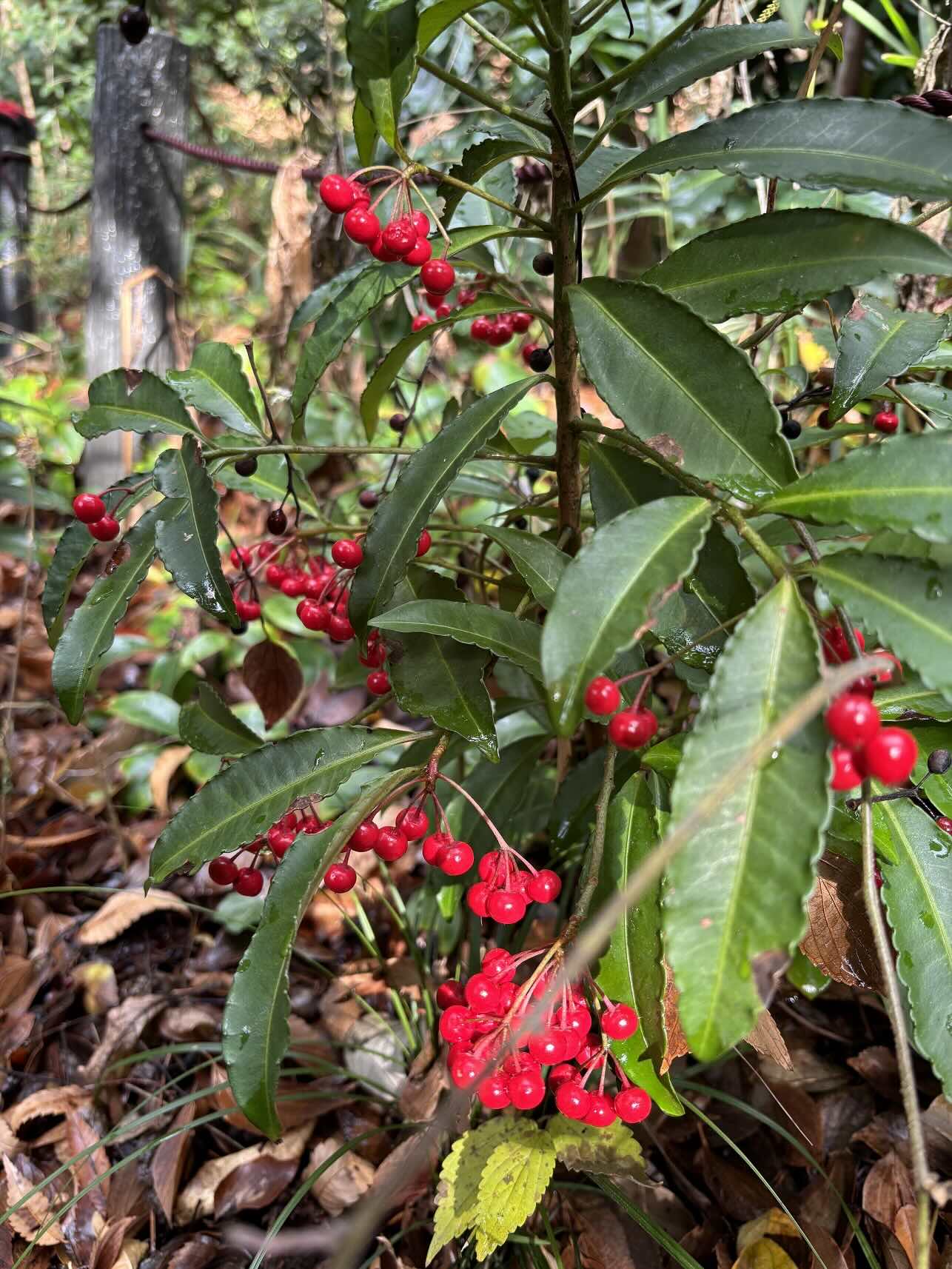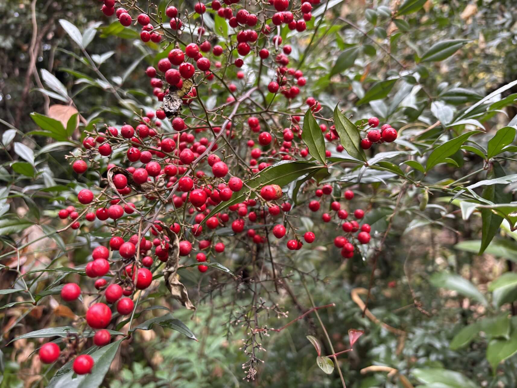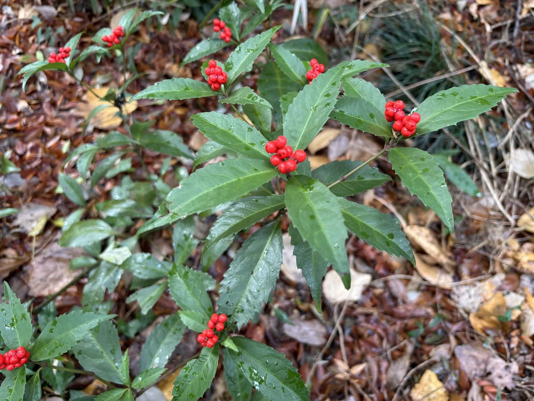 入口のムラサキシキブ・ガマズミ・ヤブミョウガ・ヒヨドリジョウゴ・ナキリスゲなど、特にセンリョウ・キミセンリョウの実が目立ち、ナンテンも実だくさんだった。マンリョウの実も赤く色づき、お正月用の生花が揃っていたのは嬉しい。フユサンゴの実も目についた。マテバシイ広場の民家側がすっきりしたので人数は少なかったが充実した活動となった。