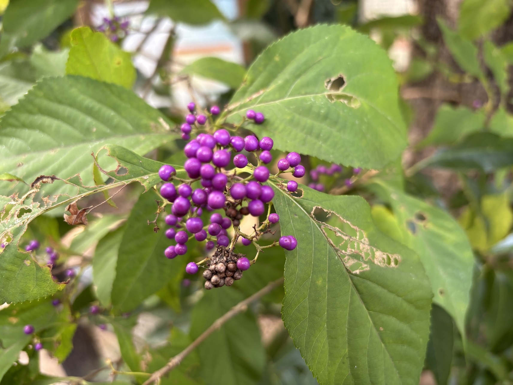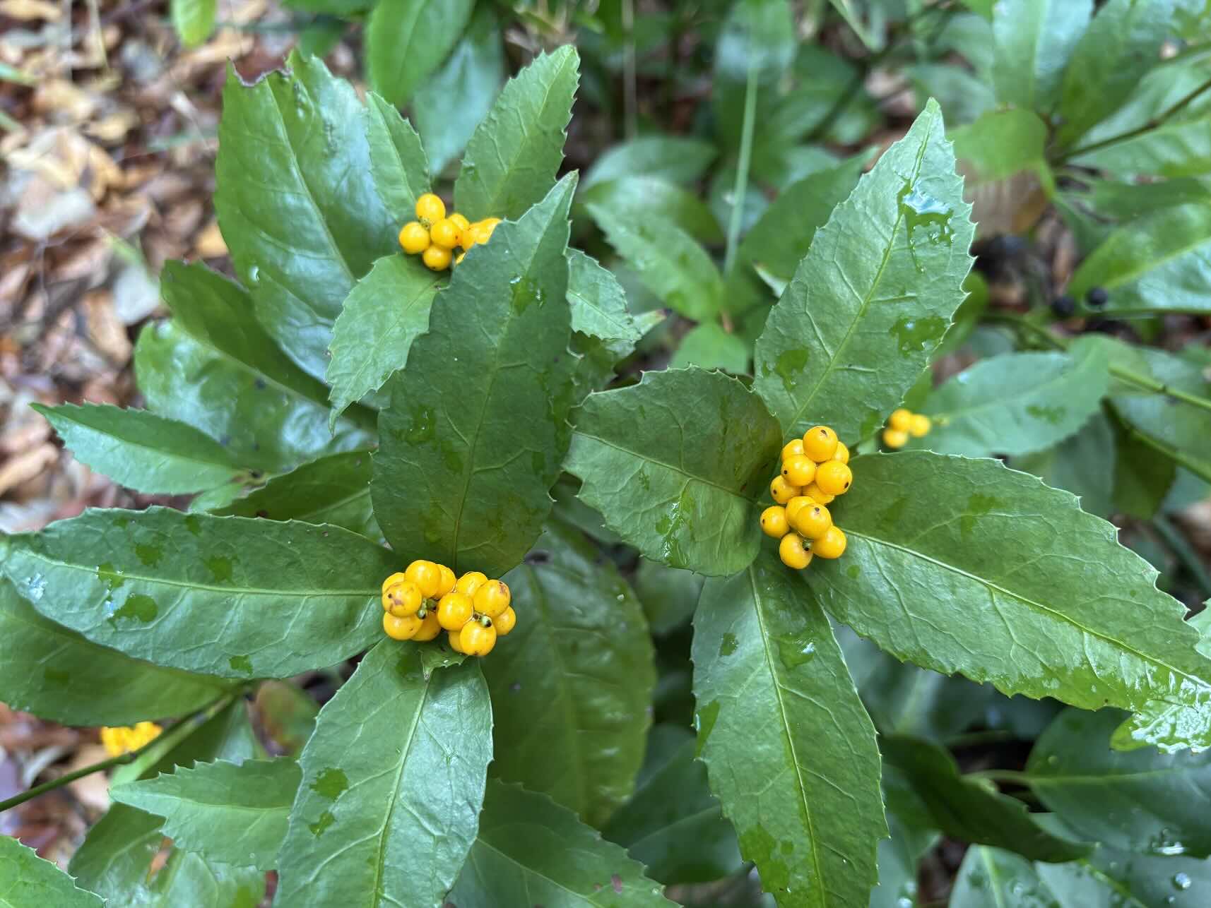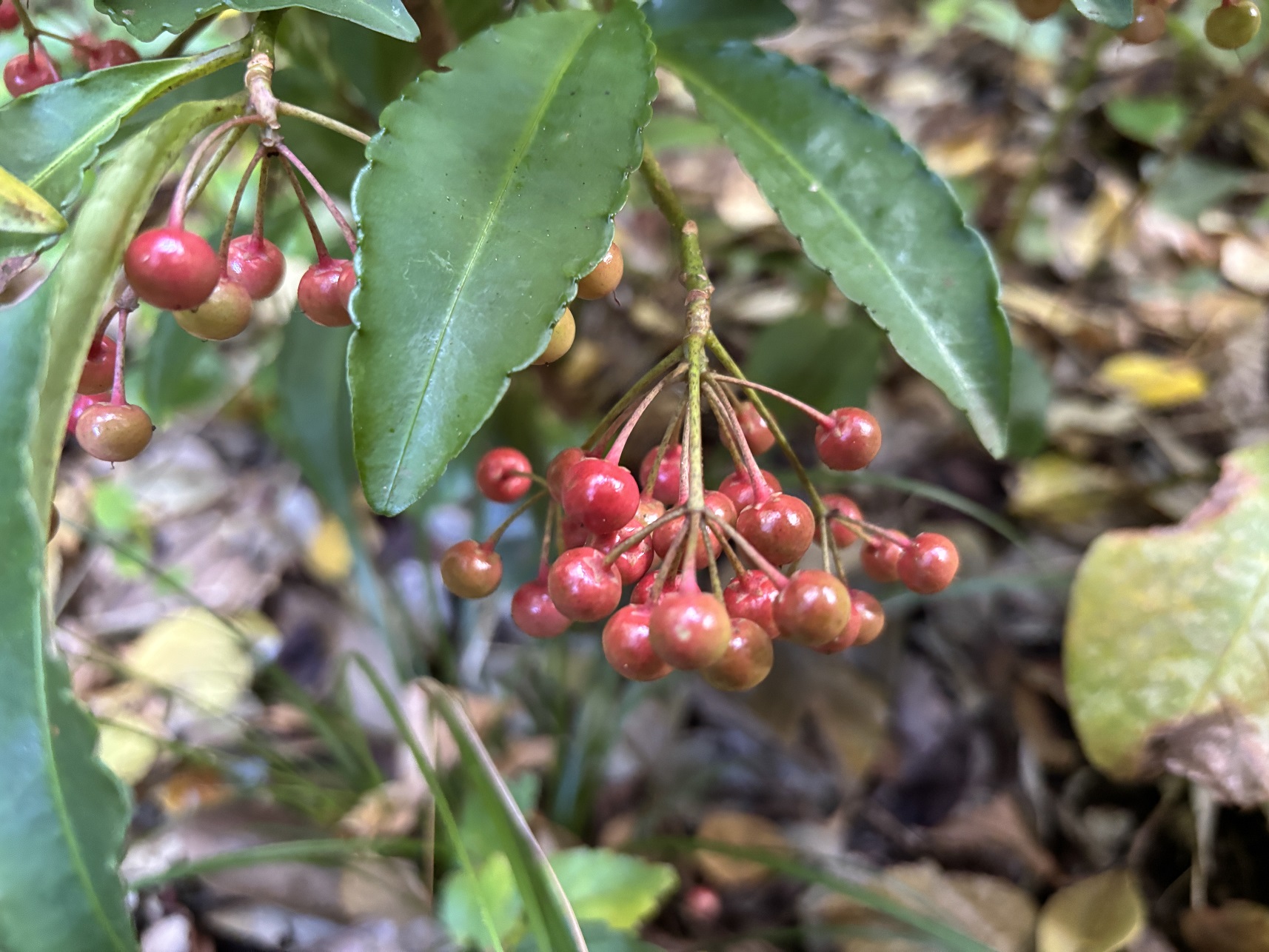 入口のムラサキシキブ・ガマズミ・ヤブミョウガ・ヒヨドリジョウゴ・ナキリスゲなど、特にセンリョウ・キミセンリョウの実が目立ち、ナンテンも実だくさんだった。マンリョウの実も赤く色づき、お正月用の生花が揃っていたのは嬉しい。フユサンゴの実も目についた。マテバシイ広場の民家側がすっきりしたので人数は少なかったが充実した活動となった。