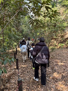 午前9時、カニ山キャンプ場に集合。メンバーで新年の挨拶を交わした後、当日の予定を共有しました。用具倉庫前で道具を準備し、東樹林へ移動しました。