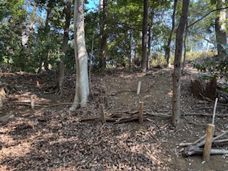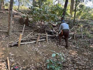 東樹林北端の境界通路では、林縁の植生が薄くなっていたため、昨年設置した竹穂垣の補強を行いました。経年劣化したしがらみ柵を補修し、西側へも延長しました。