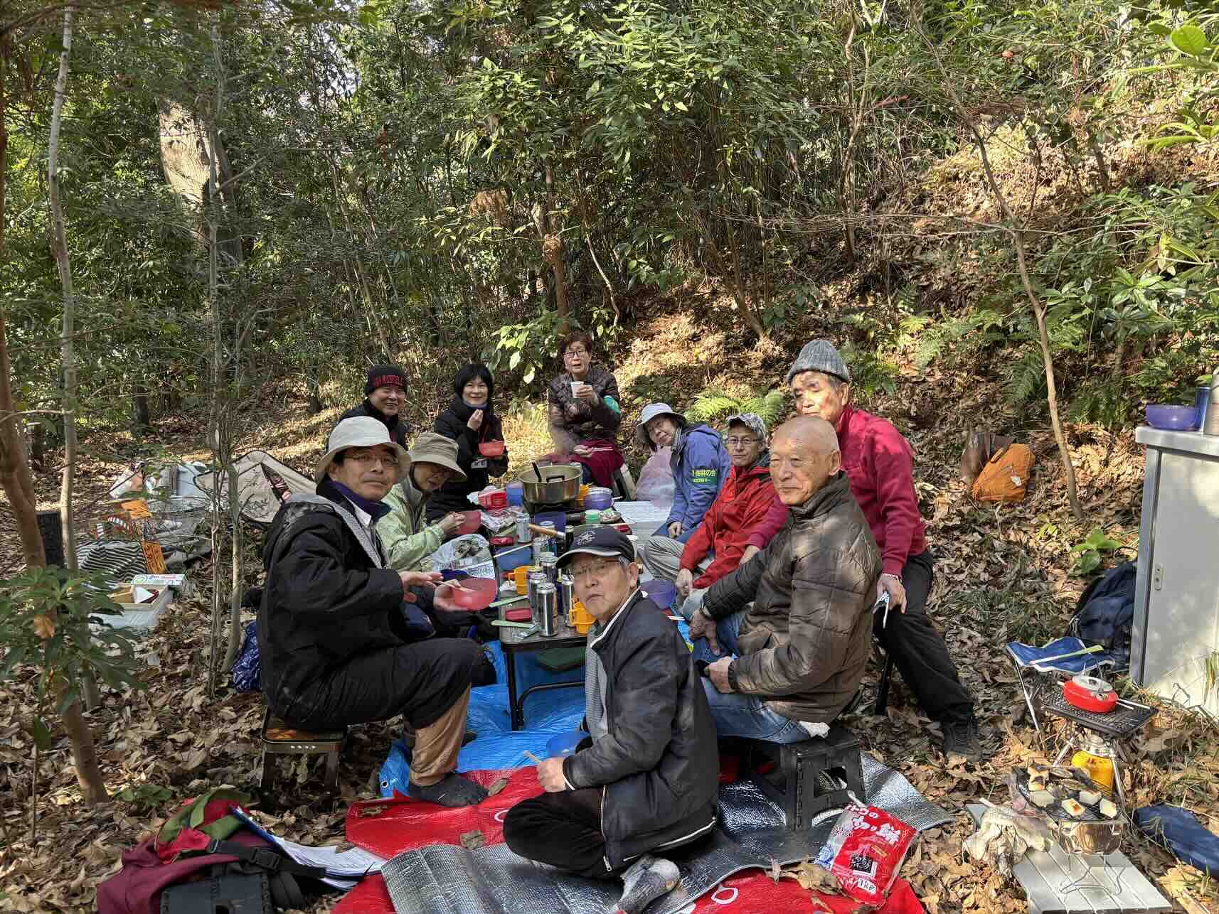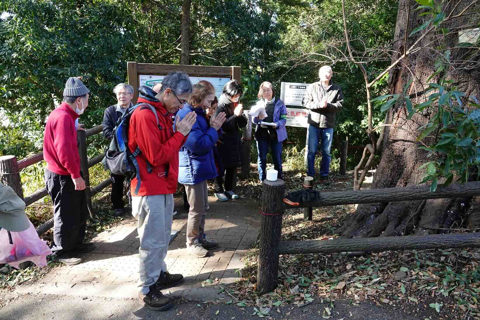 2026年最初の活動日は、晴れており調査と懇親会を行った。ボランティア講座受講生の参加もあり植生調査から始め、全員が揃ってから入口のご神木としているシラカシにお神酒・お米・塩を供えて「山開き」で今年1年の安全祈願とした。雑木林広場、ツバキの森、シャガの広場と植生調査を、マテバシイ広場で4か所の方形枠調査を林内巡回しながら行った。雑木林広場は27種、ツバキの森は9種、シャガの広場33種と10月より10種以上種数が少なく落葉によるものである。