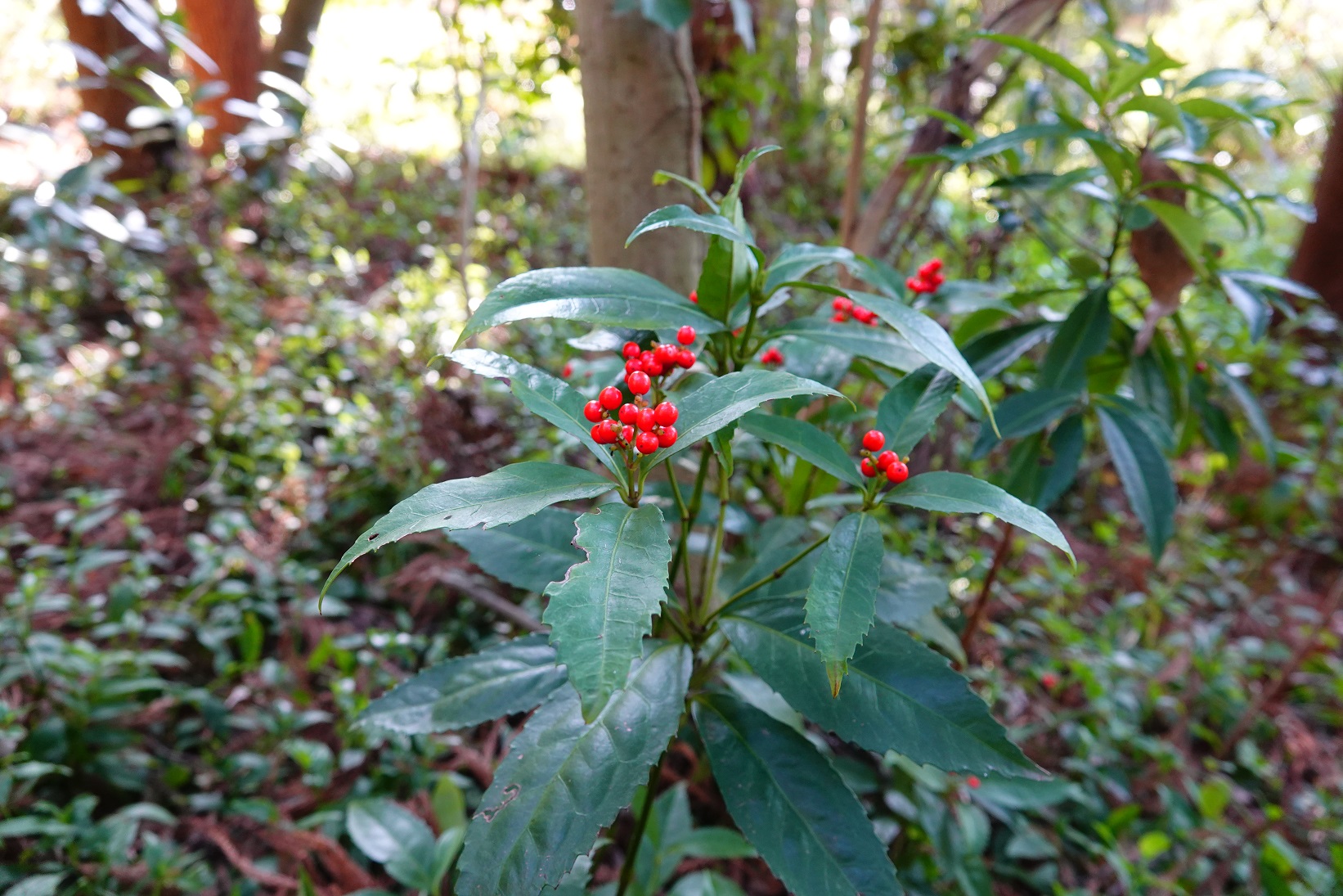 プチ違いは、ジャノヒゲとナキリスゲ、葉の表面の真ん中に縦筋がある方がナキリスゲ、断面はV字型、ジャノヒゲは葉表が平面的である。センリョウ・キミセンリョウ・マンリョウ・ナンテン・ジャノヒゲなどの実物が目立っていた。鳥はハシブトカラス・ヒヨドリ・ワカケホンセイインコ・メジロ・シジュウカラ・シロハラ・アオゲラ(ドラミング)が確認できた。懇親会は例年通り、落ち葉だめ横を整備して行った。